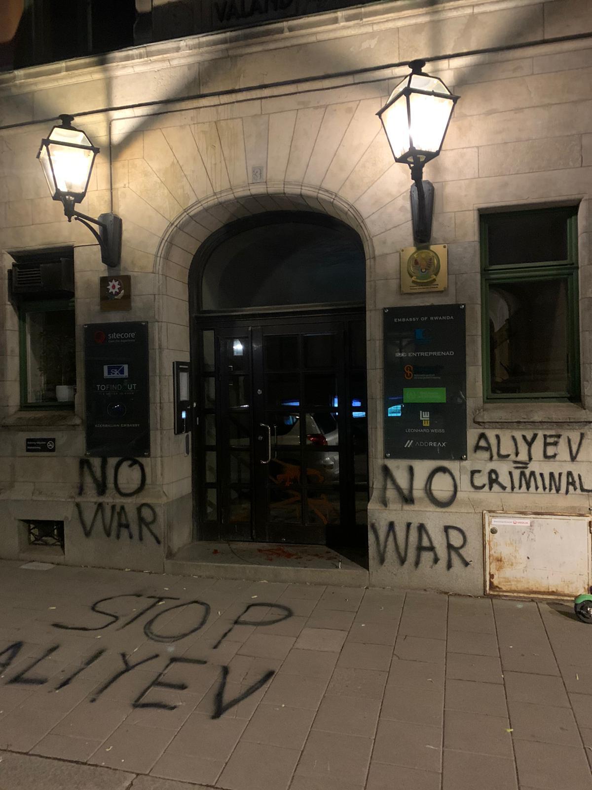 The words “No war” and “Stop Aliyev” were tagged on the facade and floor of the Azerbaijani embassy in Stockholm, Sweden overnight from Tuesday to Wednesday, sources in Sweden exclusively inform Zartonk Media.