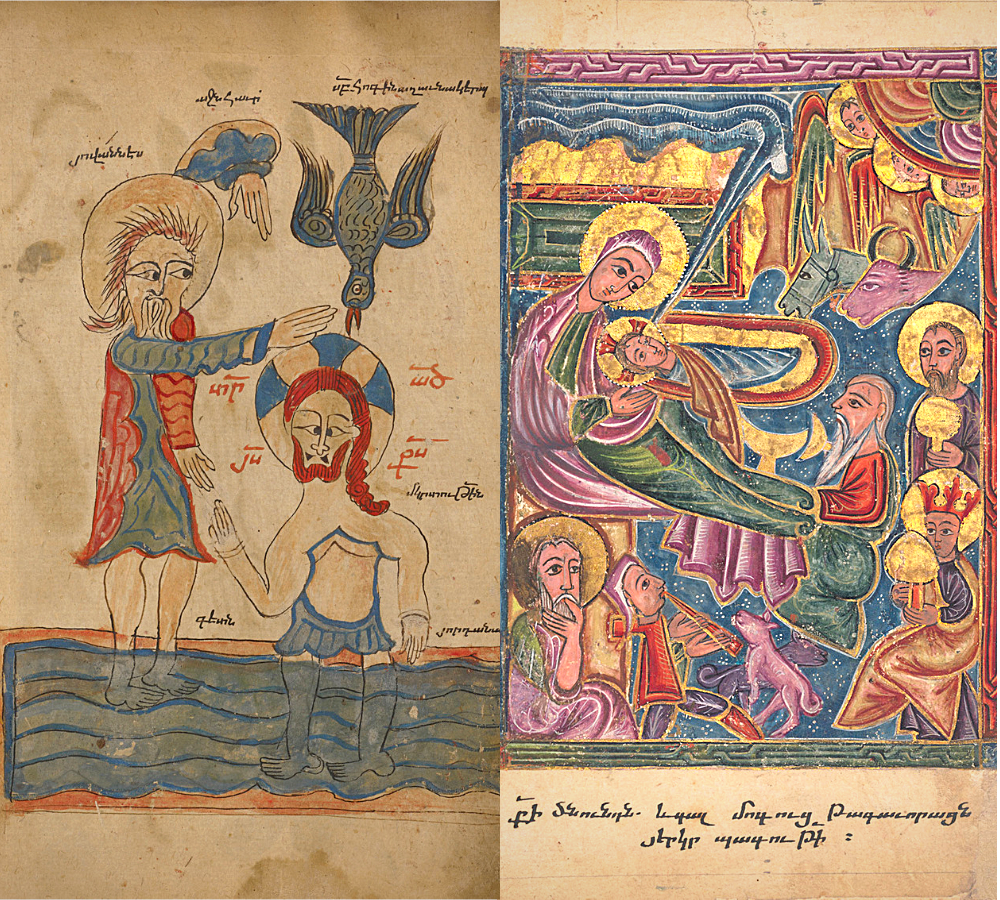 The first one is a 17th-century manuscript leaf depicting the Christian story of the arrival of Christ child on earth. The leaf was once part of a Gospel book made in 1615 and illustrated by the famous Armenian artist Mesrop of Khizan. In the early 20th century, this leaf was removed from the Gospel book”but now they are reunited.