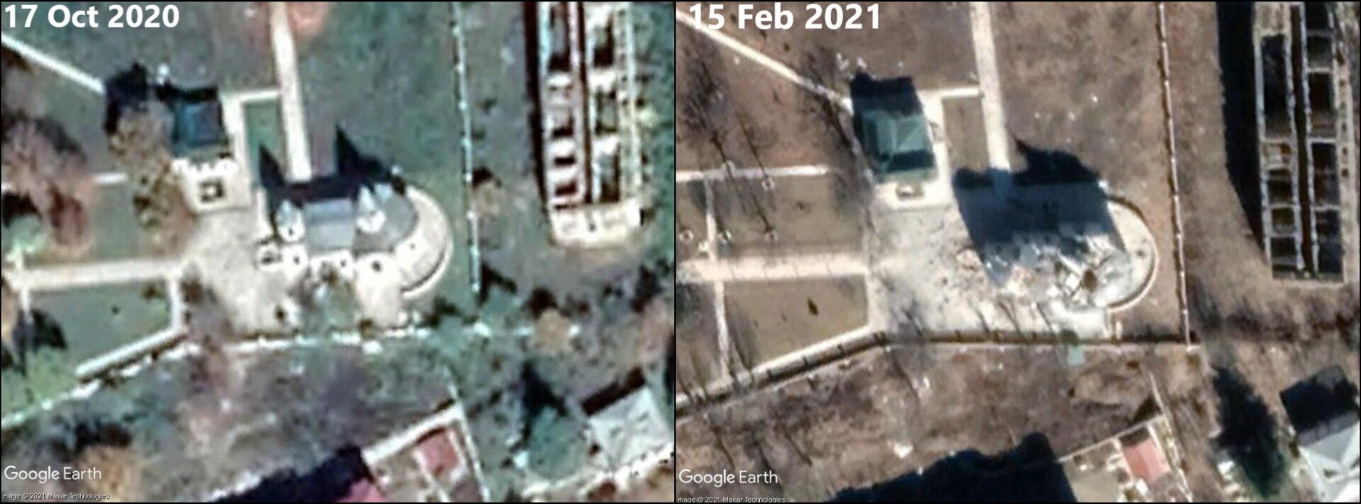 The two-picture collage featuring satellite photos from October 17, 2020 and February 15, 2021 was recently posted on Twitter by Hov Nazaretyan. Azerbaijan’s destruction of the domes of the Kanach Zham church was first reported in November 2020, days after the city came under Azerbaijani control.