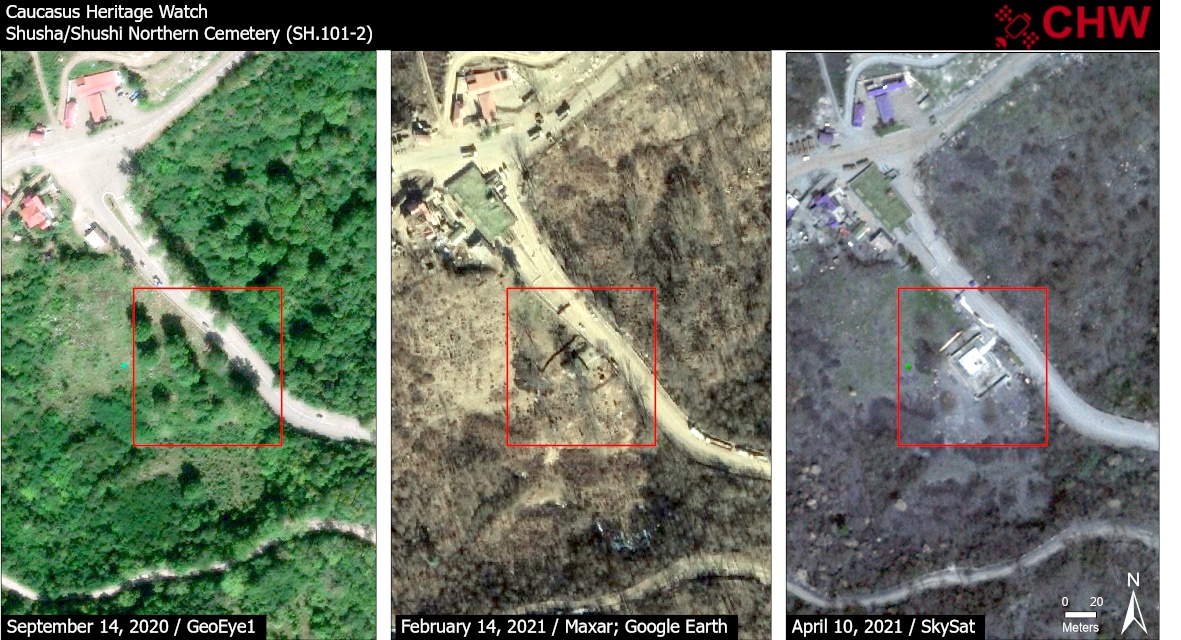 Azerbaijani Forces partially destroy a centuries-old Armenian cemetery in Artsakh’s occupied Shushi, reports the Caucasus Heritage Watch (CHW) after a high-confidence assessment. A portion of the grounds on the west side of a road leading into the city was leveled in the construction of a building complex.