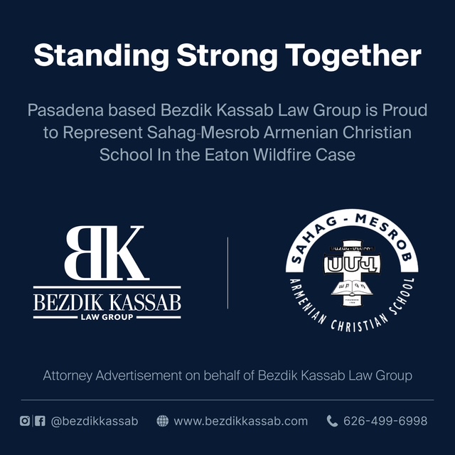 Sahag-Mesrob Armenian Christian School has engaged Pasadena based Bezdik Kassab Law Group to support the school with its legal efforts and claims amidst the devastating Eaton Fires, reports Zartonk Media.