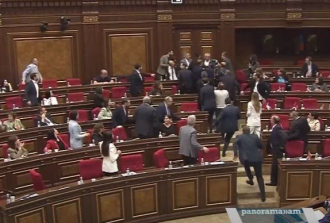 The turmoil began after opposition MP Artsvik Minasyan of the Hayastan faction announced the introduction of a bill that seeks to criminalize the denial or trivialization of the Armenian Genocide ahead of its 110th anniversary. The proposal triggered immediate friction in the chamber, leading to a scuffle between opposition MP Gegham Manukyan and Civil Contract MP Vahe Ghalumyan. The situation escalated to the point where Speaker Alen Simonyan suspended the live broadcast and called in State Protection Service officers to restore order.