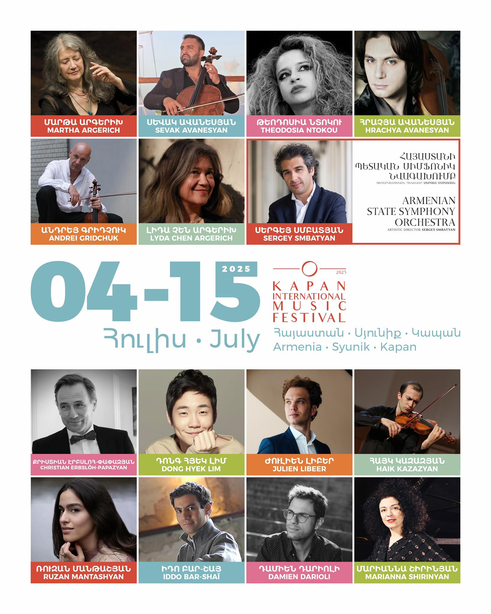 This year, Kapan Fest will once again host the Armenian State Symphony Orchestra under the baton of Maestro Sergey Smbatyan, and welcome renowned Armenian artists Astrig Siranossian, Ruzan Mantashyan, and Miqayel Voskanyan to its artistic family.