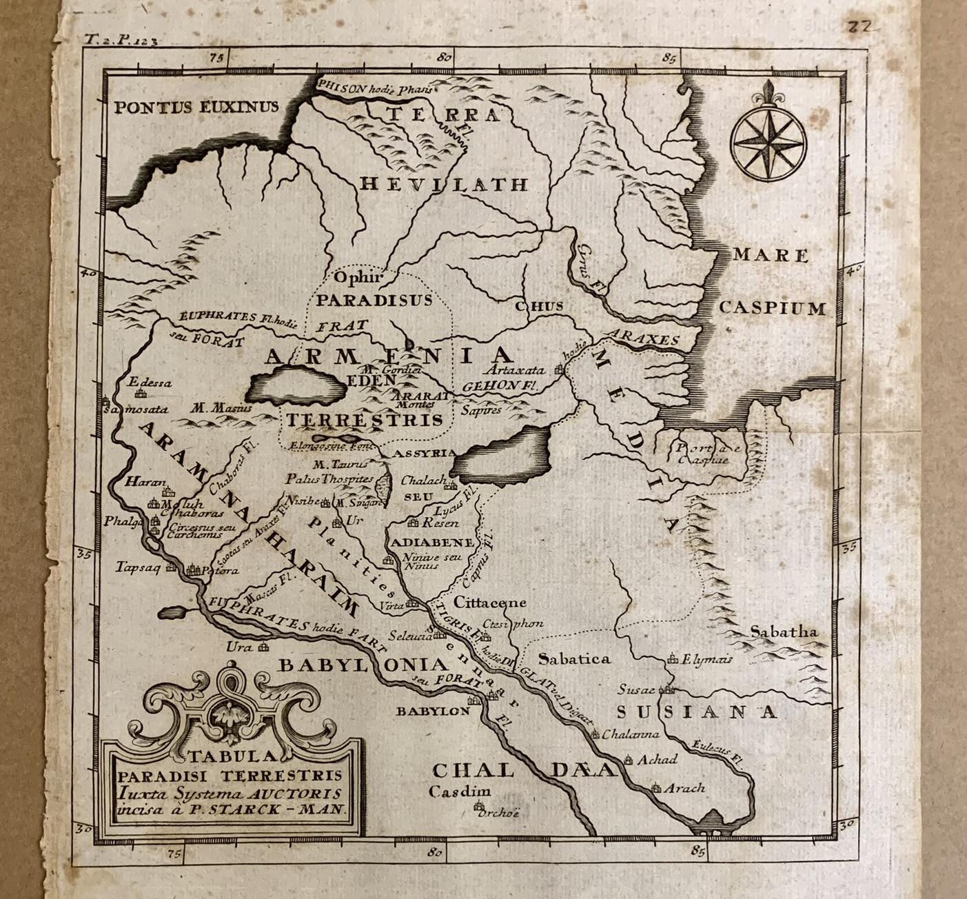 The map, titled “Tabula Paradisi Terrestris” (Map of the Earthly Paradise), depicts the Biblical Garden of Eden and surrounding lands. Armenia is placed at its heart, with Eden (Paradisius) and the Four Rivers of Paradise — the Tigris, Euphrates, Phison, and Gihon — flowing outward. Neighboring regions such as Babylonia, Assyria, Susiana, and Chaldaea are also illustrated, alongside major bodies of water including the Black Sea (Pontus Euxinus) and the Caspian Sea (Mare Caspium). By situating Eden in the Armenian Highlands, the map reflects early modern European scholarship that linked Armenia to the cradle of Biblical history.
