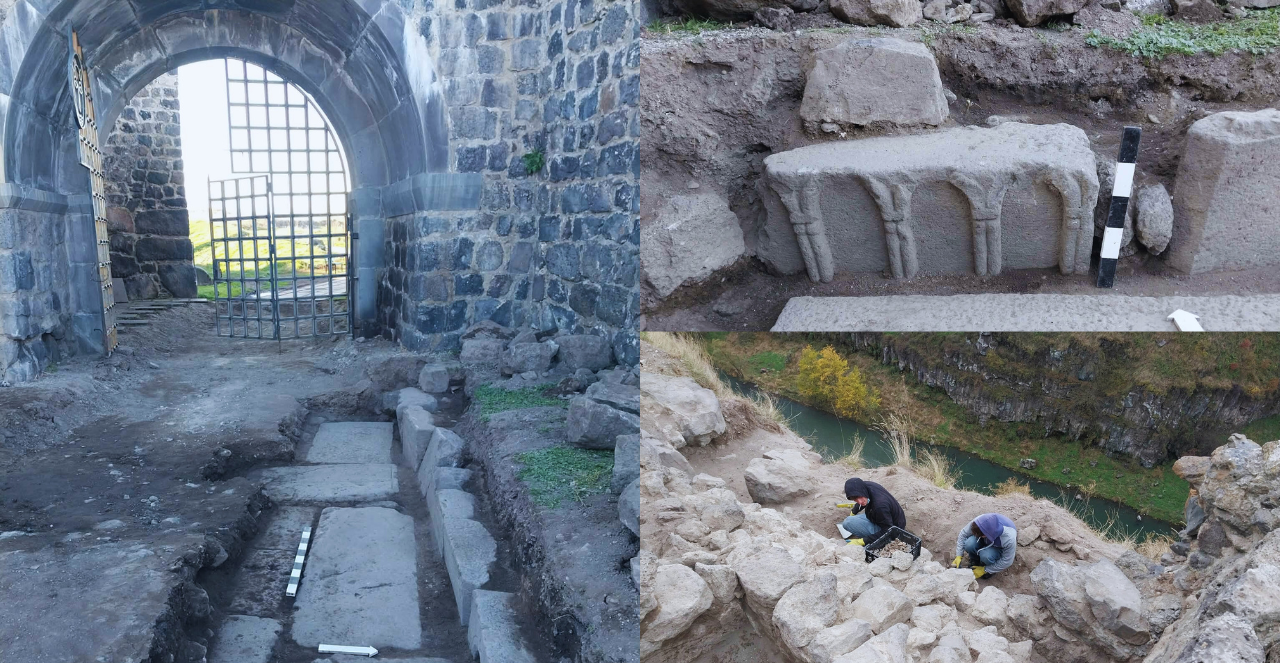 Particularly remarkable findings came from excavations near the fortress entrance, where researchers uncovered a medieval roadway paved with stone slabs and tombstones. The curbstones of the road were constructed using fragments of various architectural monuments, including sections with decorative arches and bases. These discoveries provide further insight into the advanced architectural craftsmanship and urban planning traditions of medieval Armenia, deepening understanding of Lori Fortress’s cultural and historical significance.