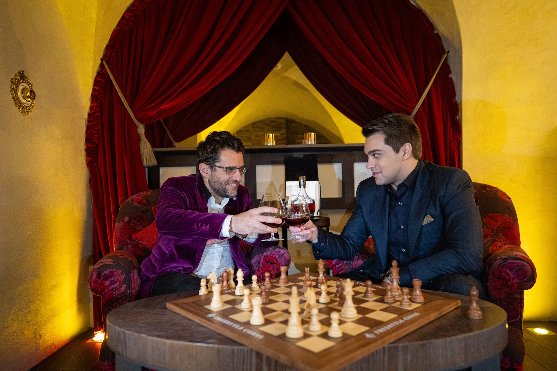 The video shows Aronian and Pogossian playing chess, alongside a tasting of the royal brandy Jardins d’Arménie and ongoing conversation.